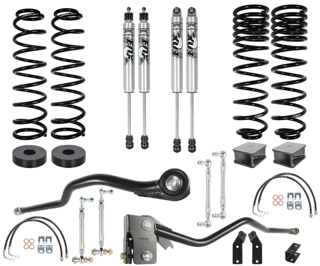To match the front, the rear is lifted 2.5” with a multi-rate coil spring, ensuring a supple ride and reasonable carry capacity. Rear geometry being similar to the front, everything is included to support flawless operation. A Rear Track Bar Riser and adjustable track bar correct axle position and minimize yaw (side-to-side body movement as the axle travels). Extended sway bar links and stainless brake lines with routing brackets keep components clear during suspension cycling. Fabricated rear bump risers are also included.