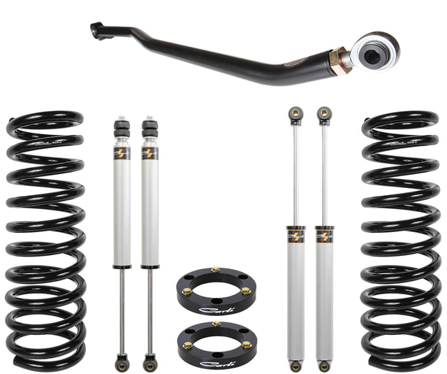 The Details: Your truck will sit 2.5”-3” higher in the front (year/cab configuration dependent) with 50% more suspension travel than the factory platform thanks to the taller, lighter rate coil springs. The rear is lifted 1”-2” via the customer’s choice of a Progressive Add-A-Pack or Full Progressive Leaf Pack. The Progressive Add-A-Pack maintains load capacity and replaces the factory overload with a 5-Leaf, progressive pack that changes the final rate of the spring pack keeping the rear planted while increasing traction and predictability. The optional Full Progressive Leaf Pack replaces the entire factory leaf spring assembly increasing travel and drastically increasing comfort (when compared to when compared to the factory springs or add-a-pack) throughout the entire usable travel stroke reducing payload to a “light” 3/4-ton spec. This can be brought back to factory capacity with the use of Carli Long Travel Airbags to achieve the best ride and adjustable rear load capacity!