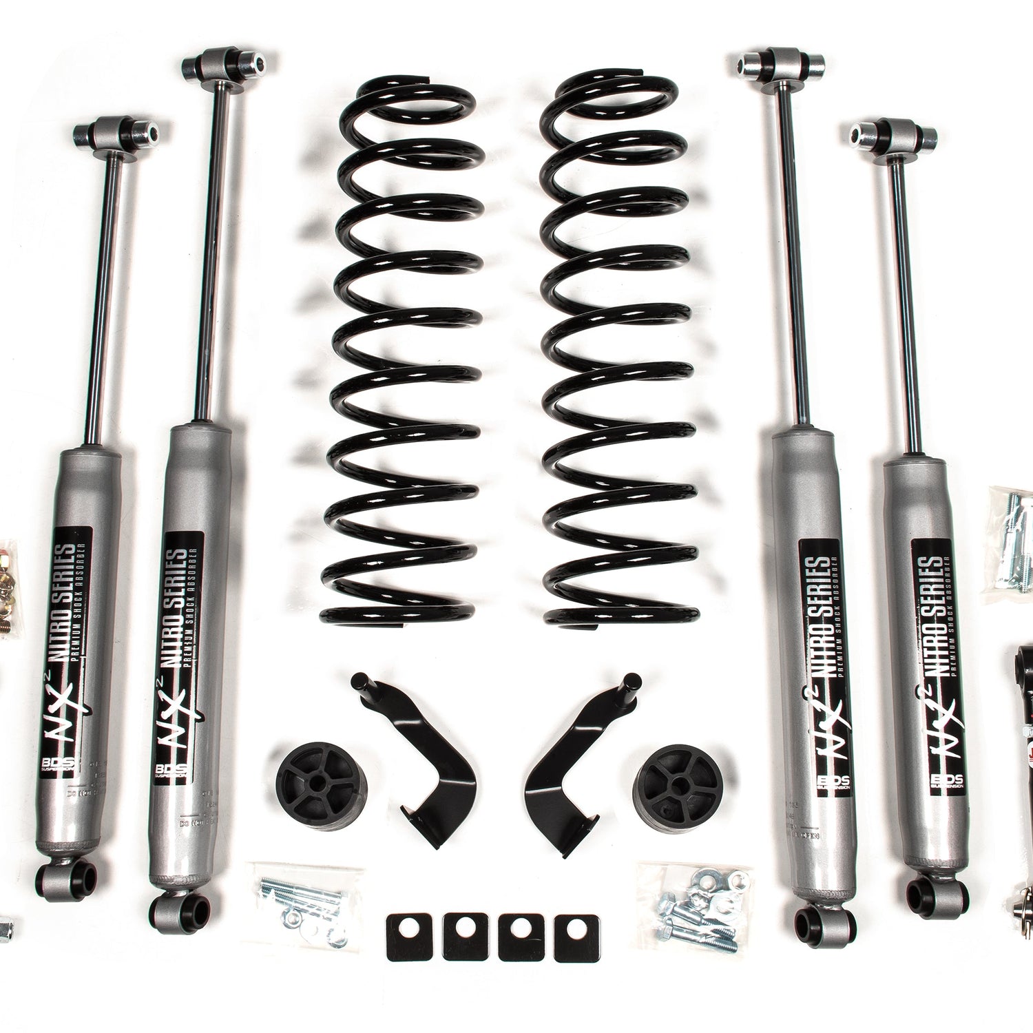 The lift kit includes front BDS Pro-Ride Coil Springs, bump stop extensions, front lower control arm cam locks, JKS quicker disconnects to unlock the front suspension's potential to flex while maintaining quiet on road operation, and your choice of specially tuned NX2 nitro series gas shocks or FOX 2.0 IFP performance series gas shocks to offer improved damper performance.
