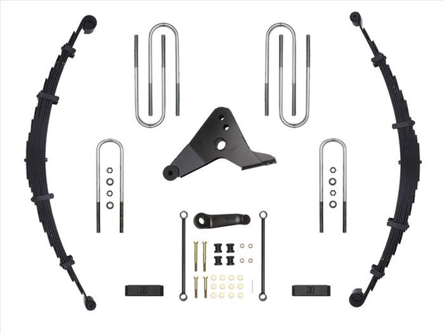 This 4" system is designed to lift your Ford Super Duty. 4" front leaf springs provide room for 35” tires. This system uses a custom progressive pack for ultimate ride quality, while providing 4" of lift. This system comes with a 1.75" bump stop spacer (not pictured) to prevent spring fatigue during the suspension cycle. Also included in this kit is 4” rear block kit, with 15” U-bolts for a leveled stance. This system is the ideal for all Super Duties.