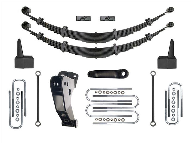 This 6" system is designed to lift your Ford Super Duty. 6" front leaf springs provide room for 35” tires. This system uses a custom progressive pack for ultimate ride quality, while providing 6" of lift. This system comes with a 1.75" bump stop spacer (not pictured) to prevent spring fatigue during the suspension cycle. Also included in this kit is 6” rear block kit, with 17” U-bolts for a leveled stance. This system is the ideal for all Super Duties.