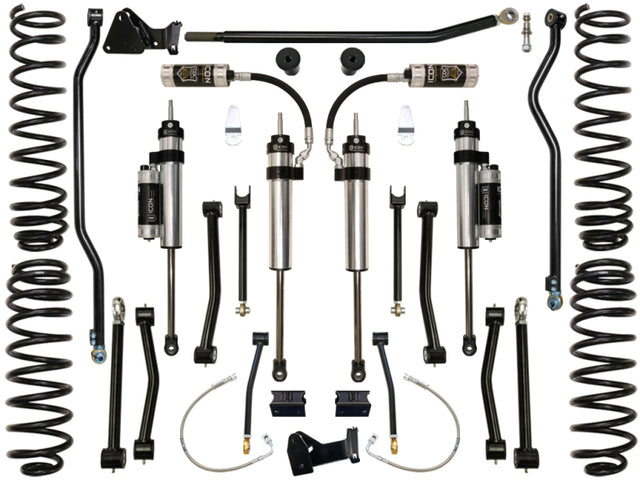 The ICON Stage 4 Jeep JK 4.5" suspension system includes dual-rate coil springs, track bar drop brackets, high-steering components, bump stop spacers, rear brake lines, rear sway bar links, complete set of front and rear links, and 2.5 Series reservoir shocks w/ CDCV. Tested and tuned, the ICON JK Stage 4 suspension system offers stability and drivability over a wide range of off-road terrains, while keeping a smooth on road feel for every day driving. This system includes 2.5" remote reservoir shocks front and rear to ensure optimum performance by increasing the duration of consistent damping regardless of situation, keeping the shocks at a cooler operating temperature during heavy use. The ICON CDC Valve upgrade is included in this stage for those desiring an easy way to tune the ride externally. Installing this kit allows proper clearance for 35" tall tires with no modifications and 37" tires with aftermarket high clearance fenders.