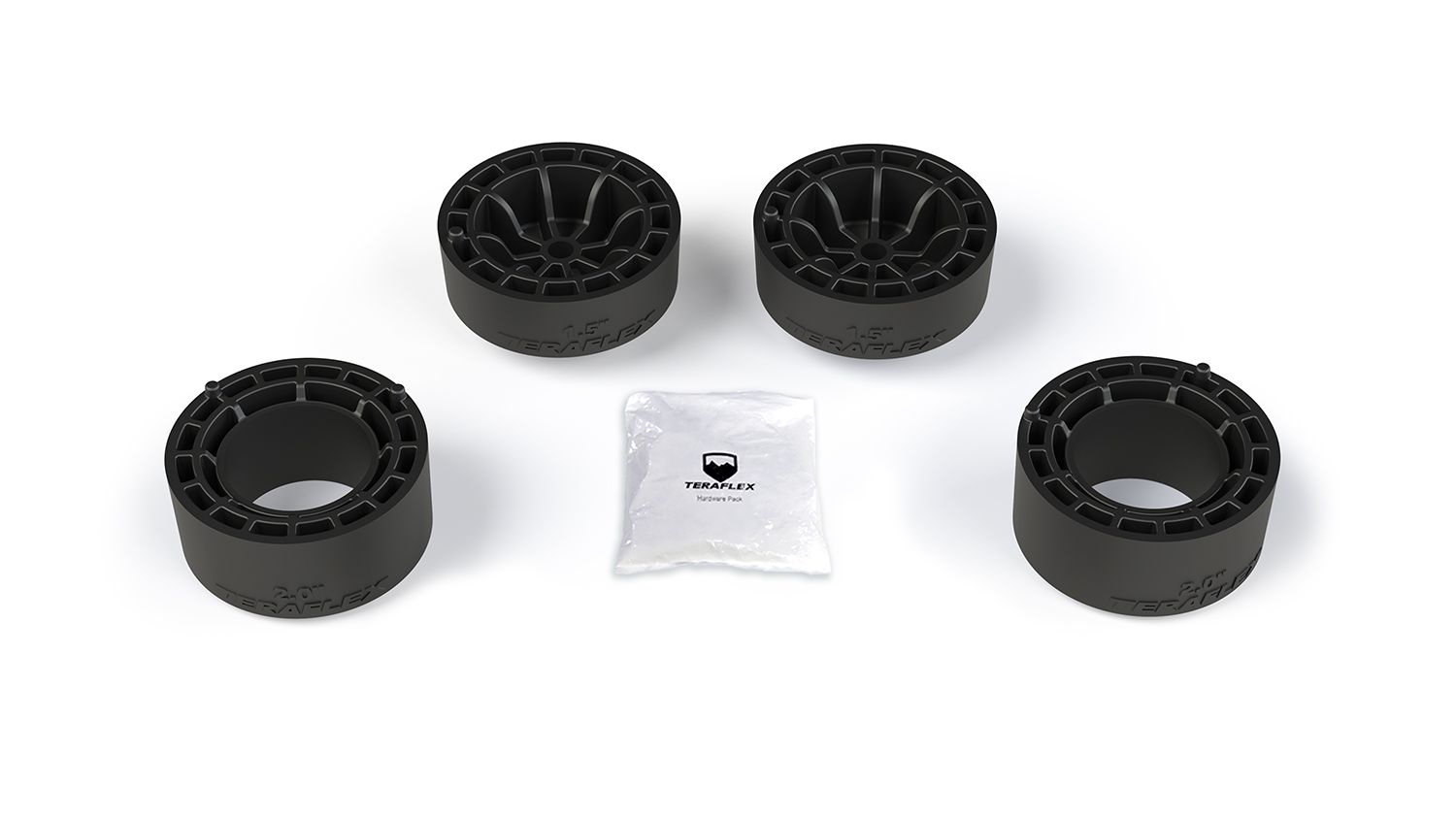 Even when reality demands that you keep your JL Wrangler Unlimited family friendly TeraFlex will satisfy your primal need to go big. The TeraFlex JL 4dr: 1.5" Performance Spacer Lift Kit allows you to run larger tires with added clearance on the trail all while maintaining family-friendly versatility. This kit also corrects the factory rake to give your JL Wrangler Unlimited some attitude thanks to a more aggressive stance. Not only does the 1.5" Performance Spacer Lift Kit clear larger tires but the additional height helps compensate for heavier aftermarket bumpers and winch a larger spare tire or weekend gear. . Does NOT include shocks. We recommend Falcon Performance SP2 Mode Adjust Shocks or TeraFlex 9550 VSS Twin-Tube Shocks. These are the only shock absorbers engineered to work with TeraFlex lift coil spring spacers to improve both compression and rebound for optimal vehicle stability. 1.5" Performance Spacer Lift Kits are offered without shock absorbers. Works with stock length shock absorbers Falcon Performance Shocks and TeraFlex 9550 VSS Shocks are available separately.