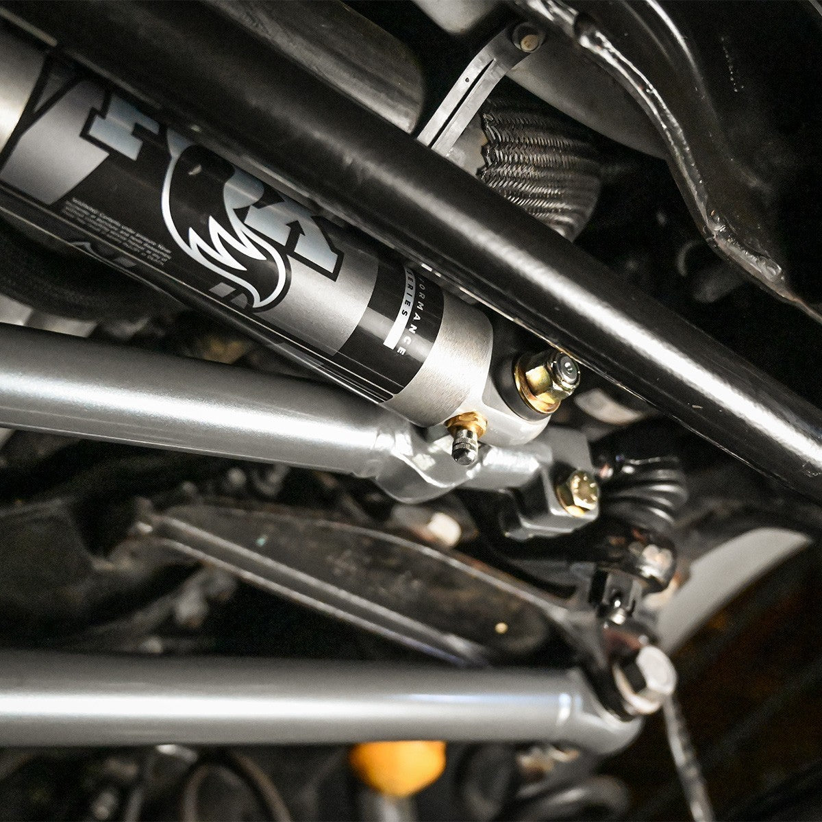 The Synergy 2005+ Ford Super Duty Steering Stabilizer Stud allows the use of many aftermarket stabilizers to be used with upgraded steering configurations on your Ford Super Duty. This Stud mounts directly into the drag link and allows you to run your preferred aftermarket stabilizer in the high mount position out of the way of any unwanted contact.