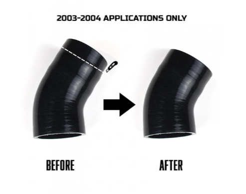 NOTES: 2003-2004 applications will need to trim the 45-degree boot at the first internal rib for proper installation. These hoses are for use with stock intercoolers or aftermarket intercoolers that utilize stock boots and tubes. On 2005-2007 models, this kit is designed to be used with the updated Ford driver side charge air tube (6C3Z-6C640-AA). If the OEM plastic charge air tube is still equipped, the two boots included in this kit for the driver side connections will not be used.