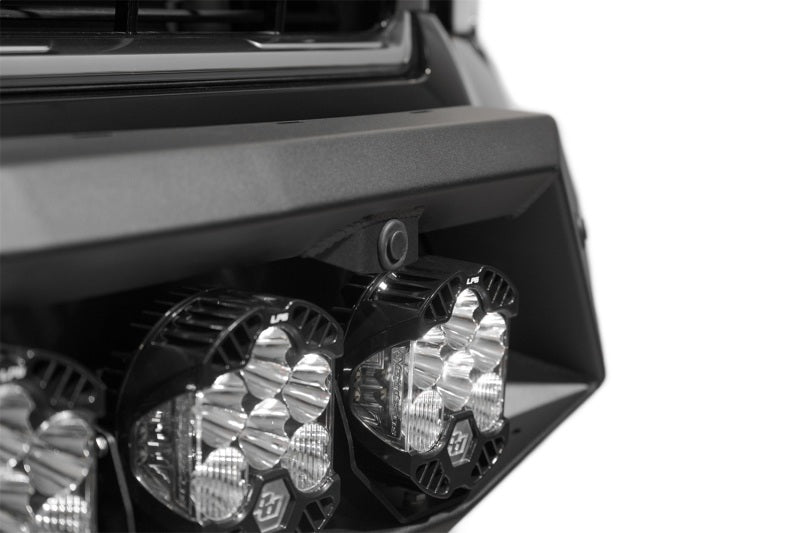 "Our Front Bumper offers off-road utility and an elevated styling. The center cutout fits either five Baja Designs LP6 lights or six RIGID Industries 360 Series 6” round lights, or two radiused 40-inch light bars. Additional lighting options are provided by 3-inch cube light mounts in the wings.