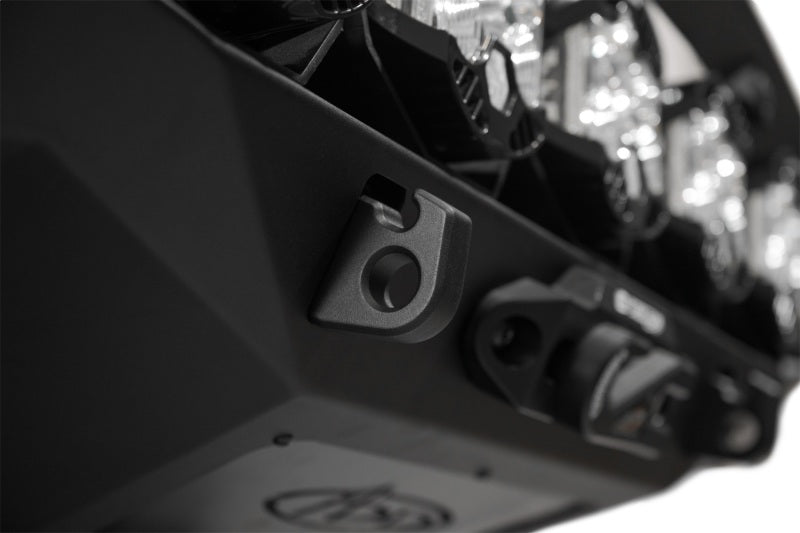 The bumper features a winch mount and two 1-inch thick D-ring mounts. It retains the OEM parking sensors and adaptive cruise control. The bumper is constructed from steel and finished in a 2-stage hammer black powder coat. It is fully bolt-on and made in the USA."