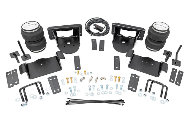 Ideal Leveling: Is your truck your workhorse? The main attraction of a pickup is the ability to haul and tow as needed. However, due to the weight in the bed or the condition of the rear leaf springs, your vehicle may become un-level under load. At Rough Country, we've designed a solution to eliminate these concerns. Introducing Rough Country's Rear Air Spring Kit.Heavy-Duty Construction: Rough Country's Rear Air Spring Kit includes two high-quality, double convoluted air bags, reinforced with durable powder-coated steel brackets and DOT-approved airlines. Whether you're towing a trailer or hauling heavy loads, this kit helps ensure your vehicle remains level, alleviating the strain on your trailer's tongue weight. The kit features 1/4" push-to-connect air fittings for easy installation, along with all necessary bracketry for a secure fit. Rough Country's Air Spring Kit supports up to 5,000 lbs of load, minimizing sway and preventing bottoming out while braking and steering.Easy Installation: Quick and simple setup for immediate use. Rough Country's kit can be installed at home with standard tools in just 5-6 hours, ensuring minimal downtime and fast, hassle-free installation.Onboard Air Compressor and Wireless Controller: For added convenience, Rough Country offers an optional onboard air compressor and wireless controller to easily adjust your air spring kit on the go. Control air pressure at the push of a button from the comfort of your vehicle.Reliable Warranty Coverage: Rough Country's Rear Air Spring Kit includes a limited lifetime warranty on the air springs and a two-year replacement warranty on the compressor, offering lasting protection against manufacturer defects. This industry-leading coverage ensures confidence in both quality and durability, so you can count on Rough Country to keep your truck performing at its best.