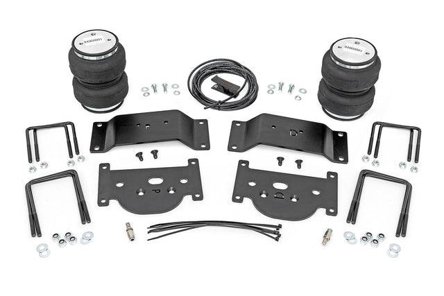 Ideal Leveling: Is your truck your workhorse? The main attraction of a pickup is the ability to haul and tow as needed. However, due to the weight in the bed or the condition of the rear leaf springs, your vehicle may become un-level under load. At Rough Country, we've designed a solution to eliminate these concerns. Introducing Rough Country's Rear Air Spring Kit.Heavy-Duty Construction: Rough Country's Rear Air Spring Kit includes two high-quality, double convoluted air bags, reinforced with durable powder-coated steel brackets and DOT-approved airlines. Whether you're towing a trailer or hauling heavy loads, this kit helps ensure your vehicle remains level, alleviating the strain on your trailer's tongue weight. The kit features 1/4" push-to-connect air fittings for easy installation, along with all necessary bracketry for a secure fit. Rough Country's Air Spring Kit supports up to 5,000 lbs of load, minimizing sway and preventing bottoming out while braking and steering.Easy Installation: Quick and simple setup for immediate use. Rough Country's kit can be installed at home with standard tools in just 5-6 hours, ensuring minimal downtime and fast, hassle-free installation.Onboard Air Compressor and Wireless Controller: For added convenience, Rough Country offers an optional onboard air compressor and wireless controller to easily adjust your air spring kit on the go. Control air pressure at the push of a button from the comfort of your vehicle.Reliable Warranty Coverage: Rough Country's Rear Air Spring Kit includes a limited lifetime warranty on the air springs and a two-year replacement warranty on the compressor, offering lasting protection against manufacturer defects. This industry-leading coverage ensures confidence in both quality and durability, so you can count on Rough Country to keep your truck performing at its best.