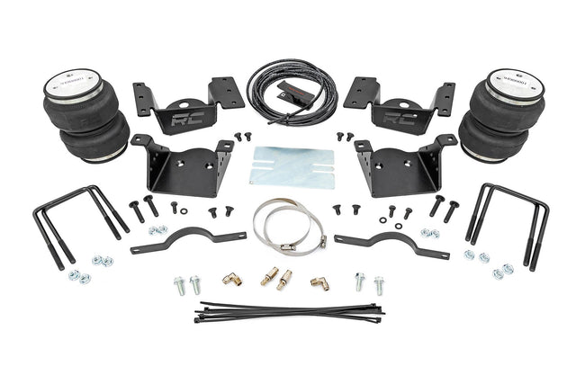 Ideal Leveling: Is your truck your workhorse? The main attraction of a pickup is the ability to haul and tow as needed. However, due to the weight in the bed or the condition of the rear leaf springs, your vehicle may become un-level under load. At Rough Country, we've designed a solution to eliminate these concerns. Introducing Rough Country's Rear Air Spring Kit.Heavy-Duty Construction: Rough Country's Rear Air Spring Kit includes two high-quality, double convoluted air bags, reinforced with durable powder-coated steel brackets and DOT-approved airlines. Whether you're towing a trailer or hauling heavy loads, this kit helps ensure your vehicle remains level, alleviating the strain on your trailer's tongue weight. The kit features 1/4" push-to-connect air fittings for easy installation, along with all necessary bracketry for a secure fit. Rough Country's Air Spring Kit supports up to 5,000 lbs of load, minimizing sway and preventing bottoming out while braking and steering.Easy Installation: Quick and simple setup for immediate use. Rough Country's kit can be installed at home with standard tools in just 5-6 hours, ensuring minimal downtime and fast, hassle-free installation.Onboard Air Compressor and Wireless Controller: For added convenience, Rough Country offers an optional onboard air compressor and wireless controller to easily adjust your air spring kit on the go. Control air pressure at the push of a button from the comfort of your vehicle.Reliable Warranty Coverage: Rough Country's Rear Air Spring Kit includes a limited lifetime warranty on the air springs and a two-year replacement warranty on the compressor, offering lasting protection against manufacturer defects. This industry-leading coverage ensures confidence in both quality and durability, so you can count on Rough Country to keep your truck performing at its best.