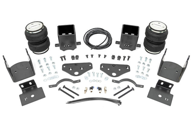 Ideal Leveling: Is your truck your workhorse? The main attraction of a pickup is the ability to haul and tow as needed. However, due to the weight in the bed or the condition of the rear leaf springs, your vehicle may become un-level under load. At Rough Country, we've designed a solution to eliminate these concerns. Introducing Rough Country's Rear Air Spring Kit.Heavy-Duty Construction: Rough Country's Rear Air Spring Kit includes two high-quality, double convoluted air bags, reinforced with durable powder-coated steel brackets and DOT-approved airlines. Whether you're towing a trailer or hauling heavy loads, this kit helps ensure your vehicle remains level, alleviating the strain on your trailer's tongue weight. The kit features 1/4" push-to-connect air fittings for easy installation, along with all necessary bracketry for a secure fit. Rough Country's Air Spring Kit supports up to 5,000 lbs of load, minimizing sway and preventing bottoming out while braking and steering.Easy Installation: Quick and simple setup for immediate use. Rough Country's kit can be installed at home with standard tools in just 5-6 hours, ensuring minimal downtime and fast, hassle-free installation.Onboard Air Compressor and Wireless Controller: For added convenience, Rough Country offers an optional onboard air compressor and wireless controller to easily adjust your air spring kit on the go. Control air pressure at the push of a button from the comfort of your vehicle.Reliable Warranty Coverage: Rough Country's Rear Air Spring Kit includes a limited lifetime warranty on the air springs and a two-year replacement warranty on the compressor, offering lasting protection against manufacturer defects. This industry-leading coverage ensures confidence in both quality and durability, so you can count on Rough Country to keep your truck performing at its best.