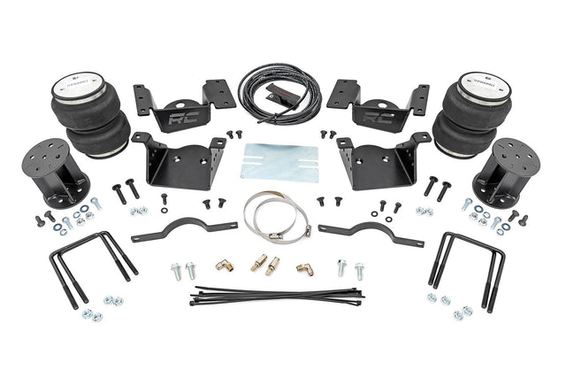 Ideal Leveling: Is your truck your workhorse? The main attraction of a pickup is the ability to haul and tow as needed. However, due to the weight in the bed or the condition of the rear leaf springs, your vehicle may become un-level under load. At Rough Country, we've designed a solution to eliminate these concerns. Introducing Rough Country's Rear Air Spring Kit.Heavy-Duty Construction: Rough Country's Rear Air Spring Kit includes two high-quality, double convoluted air bags, reinforced with durable powder-coated steel brackets and DOT-approved airlines. Whether you're towing a trailer or hauling heavy loads, this kit helps ensure your vehicle remains level, alleviating the strain on your trailer's tongue weight. The kit features 1/4" push-to-connect air fittings for easy installation, along with all necessary bracketry for a secure fit. Rough Country's Air Spring Kit supports up to 5,000 lbs of load, minimizing sway and preventing bottoming out while braking and steering.Easy Installation: Quick and simple setup for immediate use. Rough Country's kit can be installed at home with standard tools in just 5-6 hours, ensuring minimal downtime and fast, hassle-free installation.Onboard Air Compressor and Wireless Controller: For added convenience, Rough Country offers an optional onboard air compressor and wireless controller to easily adjust your air spring kit on the go. Control air pressure at the push of a button from the comfort of your vehicle.Reliable Warranty Coverage: Rough Country's Rear Air Spring Kit includes a limited lifetime warranty on the air springs and a two-year replacement warranty on the compressor, offering lasting protection against manufacturer defects. This industry-leading coverage ensures confidence in both quality and durability, so you can count on Rough Country to keep your truck performing at its best.