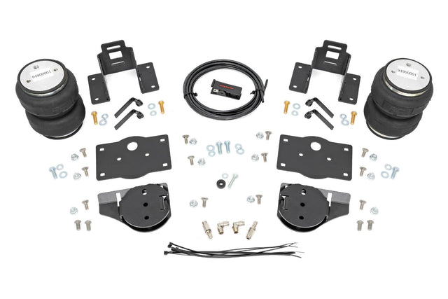 Ideal Leveling. Is your truck your workhorse? The main attraction to the pick-up line is the accessibility to haul and tow as desired. However, due to the amount of weight in the bed, or the condition of the vehicle's rear leaf springs, this can cause the vehicle to be un-level when under load. Here at Rough Country, we created an innovative new product to ensure that these are troubles of the past. Introducing, Rough Country's Rear Air Spring Kit.Heavy-duty Construction. Rough Country's Rear Air Spring Kit features two RC branded high-quality double convoluted airbags complemented with DOT-approved airlines. Whether you plan on towing or hauling in the not-so-distant future Rough Country's Air Spring kit is the must-have accessory to ensure that your trailer is level reducing the weight off of the tongue of your trailer.  Each kit offers 1/4" push connector fittings and all of the bracketry needed to ensure installation is lightning fast and secure! Rough Country's Air Spring kit provides up to 5,000 lbs of load support to ensure that you experience less sway and bottoming out when braking and steering! \