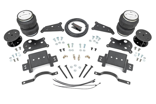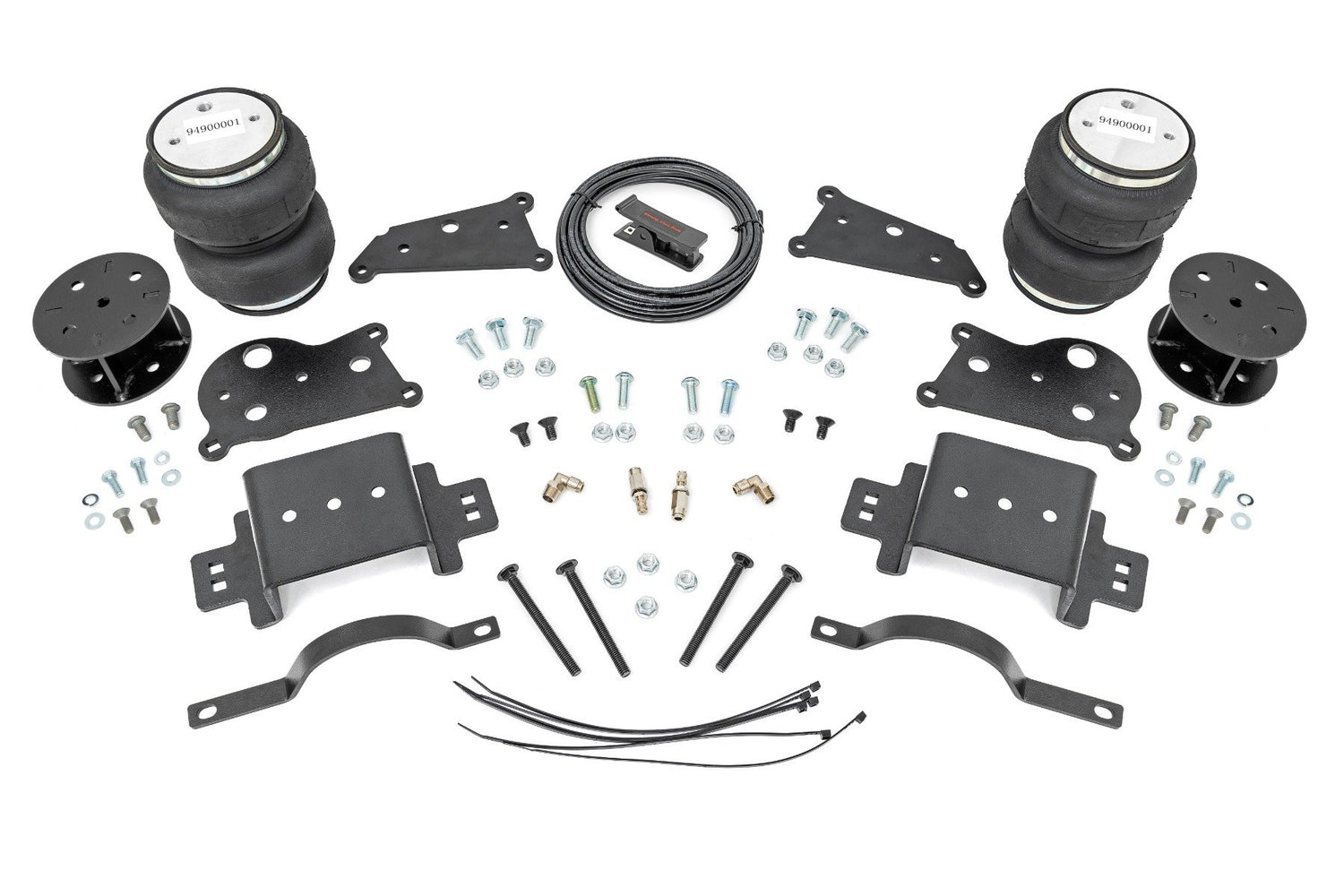 Ideal Leveling. Is your truck your workhorse? The main attraction to the pick-up line is the accessibility to haul and tow as desired. However, due to the amount of weight in the bed, or the condition of the vehicle's rear leaf springs, this can cause the vehicle to be un-level when under load. Here at Rough Country, we created an innovative new product to ensure that these are troubles of the past. Introducing, Rough Country's Rear Air Spring Kit.Heavy-duty Construction. Rough Country's Rear Air Spring Kit features two RC branded high-quality double convoluted airbags complemented with DOT-approved airlines. Whether you plan on towing or hauling in the not-so-distant future Rough Country's Air Spring kit is the must-have accessory to ensure that your trailer is level reducing the weight off of the tongue of your trailer.  Each kit offers 1/4" push connector fittings and all of the bracketry needed to ensure installation is lightning fast and secure! Rough Country's Air Spring kit provides up to 5,000 lbs of load support to ensure that you experience less sway and bottoming out when braking and steering! \