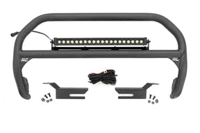 Rough Country's Nudge Bar can be equipped with four round LED lights, or a single row 20" LED light bar! Rough CountryΓÇÖs all-weather LED lights feature a durable, die-cast aluminum housing and include a premium, waterproof, flat-wound, braided wiring harness with toggle switch and in-line fuse.