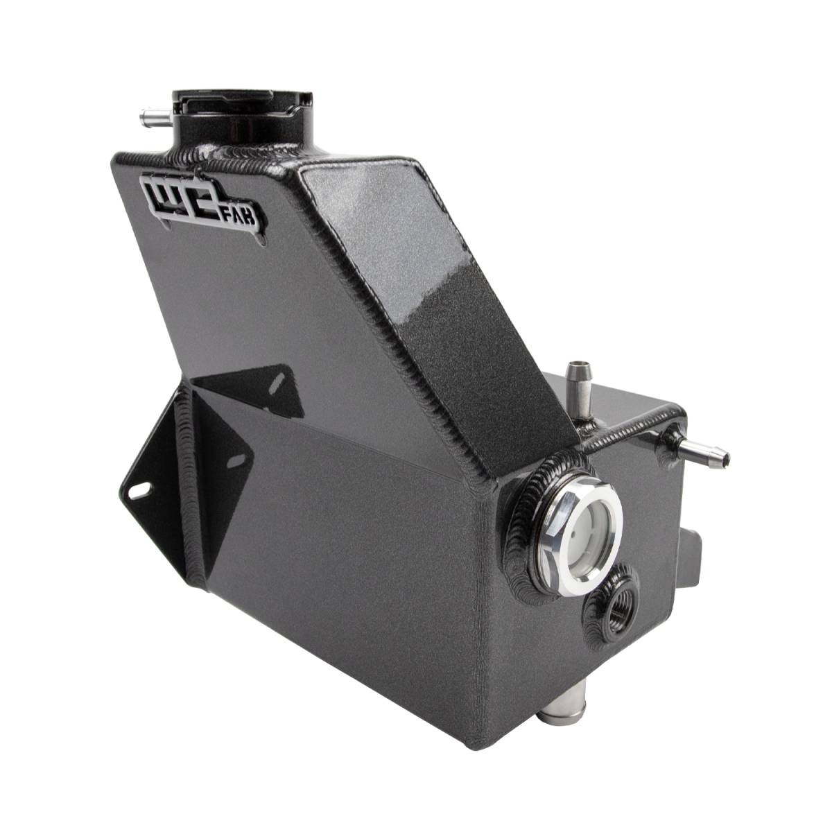 2013-2018 6.7L Cummins Fabricated Aluminum Coolant Tank Kit, mounts in OEM coolant tank location. All New Design. Dress up your engine bay by replacing the ugly clear plastic coolant reservoir with our custom powder coated fabricated aluminum coolant tank with sight glass. Includes black anodized CNC machined billet aluminum cap, mounting hardware, overflow hose and low coolant sensor. Will fit on stock trucks with no other modifications necessary. Uses OEM mounting points. Installs with basic hand tools. Compatible with stock / drop-in turbochargers and provides additional clearance for larger aftermarket and compound turbo setups.